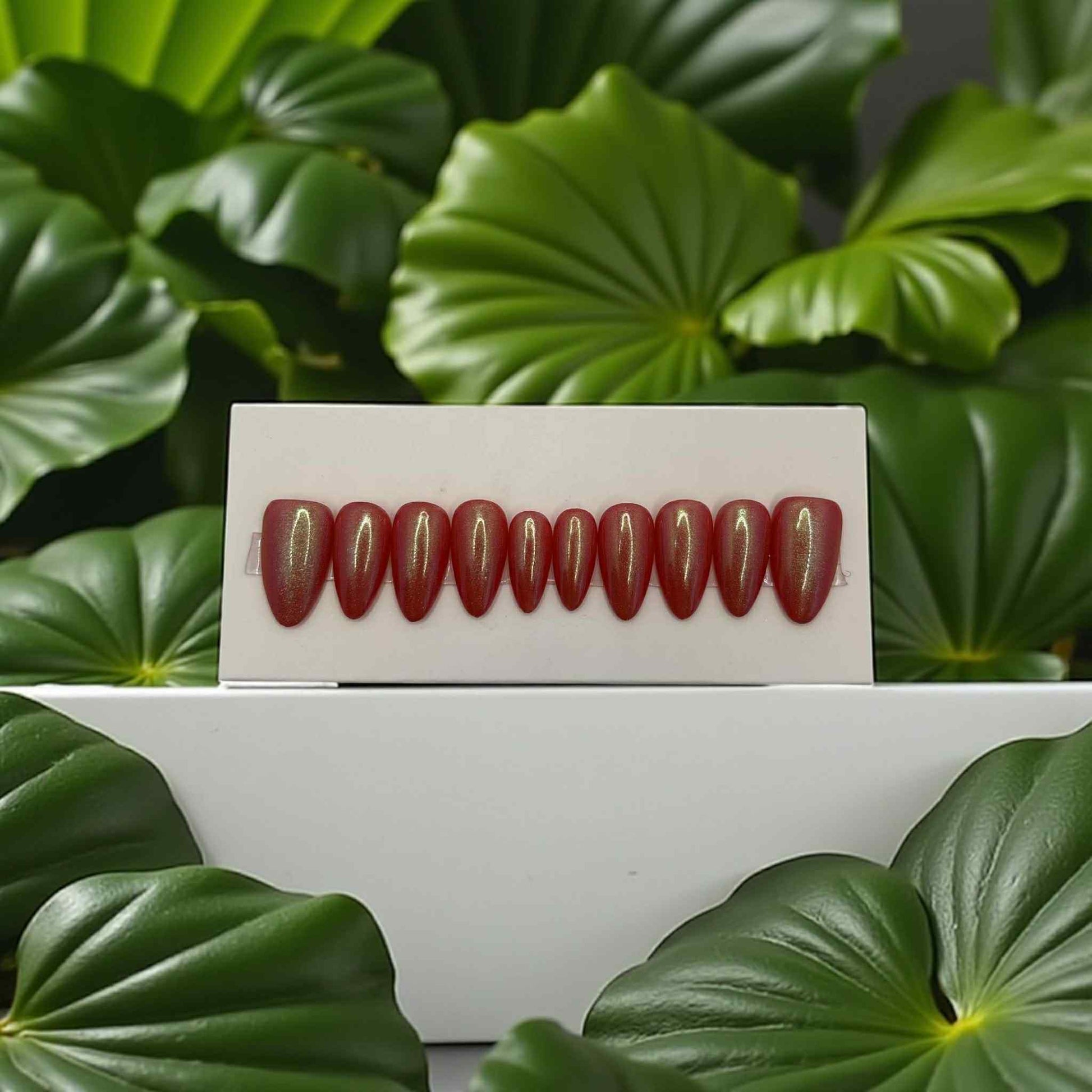 Transform your nails with our Chrome Red Press On Nails. These homemade nails are shaped in a trendy almond style and coated in a mesmerizing chrome red finish. Add a touch of sophistication and style to any outfit with these easy to use press on nails!
